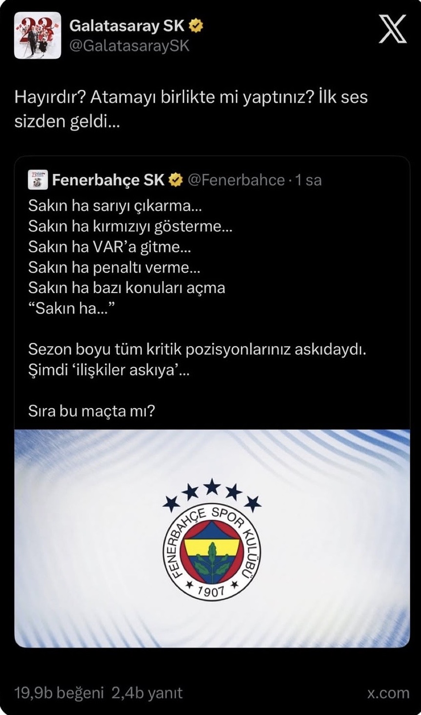 Apasport.az xəbər verir ki, “sarı-lacivərdlilər” rəsmi hesabında etdiyi paylaşımda “sarı kart göstərmə”, “qırmızı kart vermə”, “VAR-a getmə” və “penalti təyin etmə” kimi məqamları ironik formada qeyd edərək "Qalatasaray"a sataşıb.